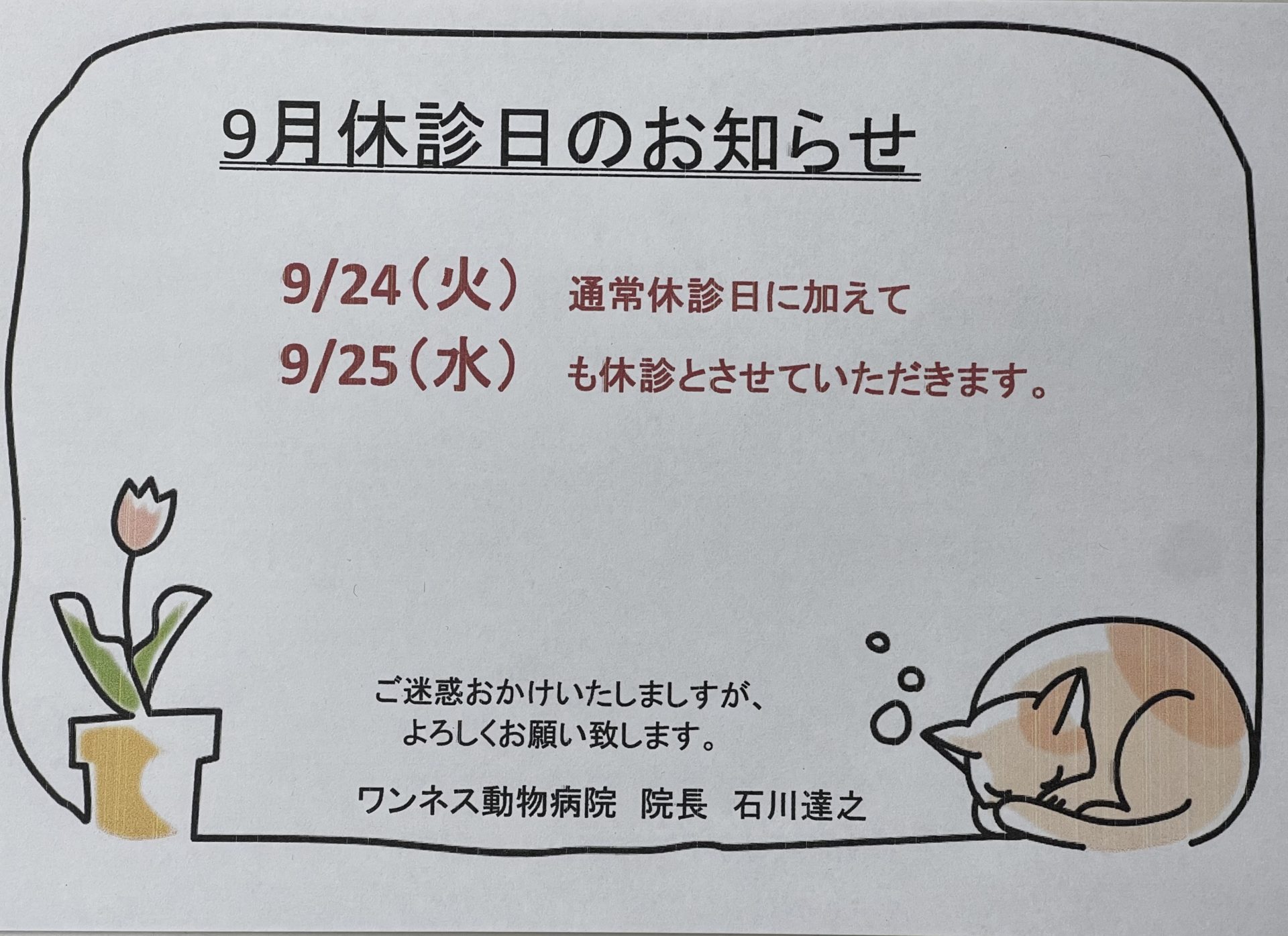 9/24火曜日 9/25水曜日 休診です。|川崎市幸区の動物病院・里親探しならワンネス動物病院へ。
