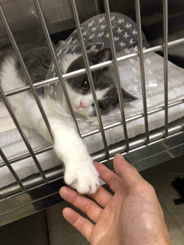 手術後エリザベスカラーを付けています。 とても大人しくしていますが、時折、寂しくなる様で、ケージの中から手を出して遊ぼうと催促されます。